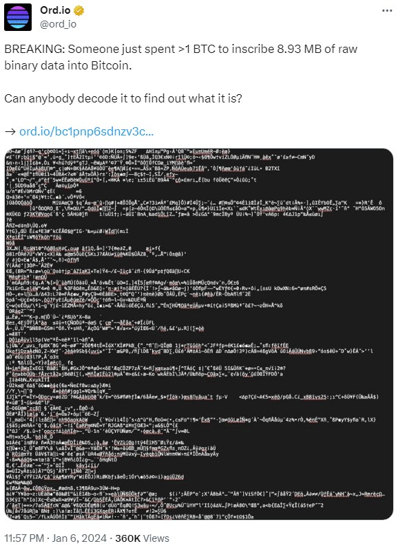 据 X 平台(前身为 Twitter)上的区块链浏览器 Ordinals Ord.io 报道,1 月 6 日,世界标准时间 11:20 左右,超过 1 个比特币被用来创建 332 个铭文。