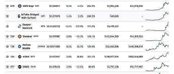 在这个赛道中,有几个项目特别引人注目,例如Helium、Streamr和WiFi Map。这些项目在过去一周的增长超过了100%,显示了它们在市场上的强劲表现。它们的成功在于有效地利用了区块链技术,提供了创新的解决方案来优化现有的网络资源。