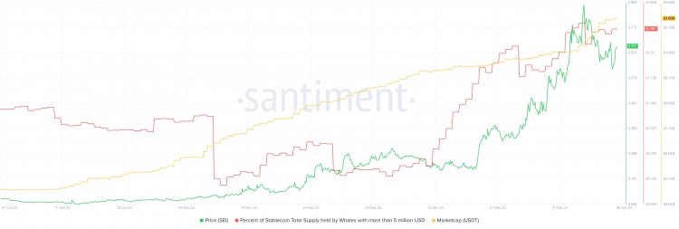 Santiment 持有超过 500 万美元的鲸鱼在稳定币总供应量中所占的百分比强化了看涨论点,上升表明有意在**次回调时购买 SEI。