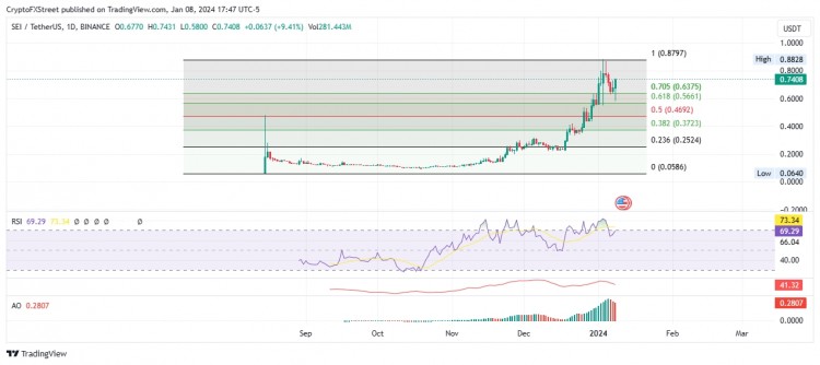 由于 70.5% 斐波那契水平保持在 0.6375 美元的支撑位,Sei 价格可能会收复区间高点 0.8828 美元。