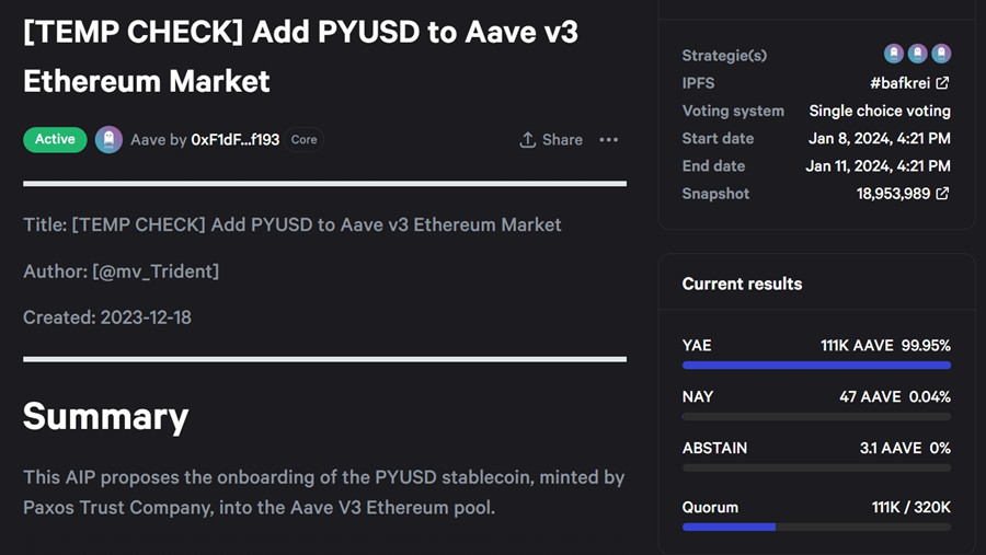 在去年12月底,PYUSD已在Curve上线,如今PYUSD再次寻求在借贷协议Aave上部署,目前Aave正对是否添加PYUSD至Aavev3以太坊池进行社区投票,**投票将于1月11日结束,目前赞成票达99.95%,不过尚未达到投票门槛。