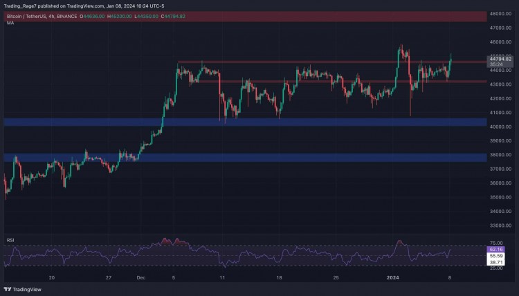 然而,价格目前突破 45,000 美元阻力位。