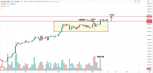 昨天这根K线突破也是有大量能释放 短线这个位置**是赶快整理2根 然后第三根赶快继续突破47000 然后下一个压力位有可能就是49000 不过短期在这个位置我们也要去观察 他不能又回到这个45800的下方 如果回来的话 我们就要防止比特币主力会不会又在这个区间里面继续盘整