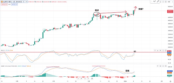 不过从这个高点涨上去就是价格过高 其实指标也是在低点的位置 或者是现在比特币价格再一次创造新高 然后这个macd指标在短期也是有一点背离 包括我们可以观察一下日线的这个kdj指标