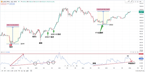 或者我们可以观察一下比特币在2015年的牛市也是一样 一个低点和一个低点都是在走低 然后下方dmi指标早就在底部的第二个低点就要开始启动一波上涨 但是后面在这里也是有一个黑天鹅事件 后面也是跌出了一个低点