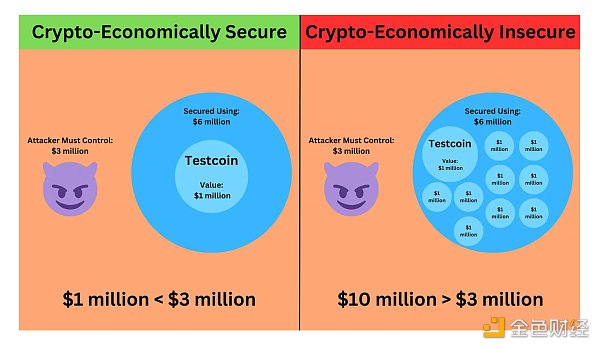 以以太坊上的 Layer-2 为例,名为 Testcoin,锁定价值 100 万美元,由价值 600 万美元的重新质押 ETH 担保。对于攻击者来说,要获得 Testcoin 网络的控制权并获取 100 万美元的锁定价值,他们需要控制超过 50% 的网络,即 300 万美元(重新质押的 ETH 的一半)。乍一看,Testcoin 似乎在加密经济上是安全的,因为一次失败的攻击的成本(被削减 300 万美元)超过了一次成功攻击的潜在 100 万美元收益,从而阻止了理性的经济参与者。