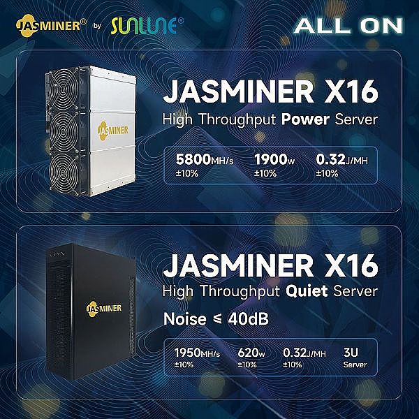 在CES 2024展会上,SUNLUNE将为大家带来一系列精彩活动,包括**技术分享和JASMINER X16系列产品展示。JASMINER X16系列是SUNLUNE公司推出的**一代Crypto领域算力产品,采用存算一体核心芯片技术,结合自身低功耗的优势,除了可以面向专业场地外,还可以进入家庭,进一步推动全球消费者电子产品“去**化”。JASMINER X16-Q(高通量静音型服务器)额定算力为1950MH/s±10%,功耗**620W±10%,能效比为**的0.32J/MH±10%,同时具备全新升级的8G(DAG)存储,支持ETCHASH与ETHASH算法,形态为3U标准规格尺寸,运行噪音**40dB±10%,能够满足家庭、IDC机房等环境的各种复杂计算需求。JASMINER X16-P(高通量强力型服务器)额定算力高达5800MH/s,功耗为1900W±10%,能效比同样为**的0.32J/MH±10%,其适用于更加复杂的网络计算,可以为用户提供更强大的Crypto算力支撑。