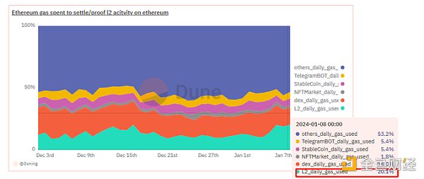 目前L2的验证和清算消耗的Gas费,占以太坊主网Gas消耗的10~20%。其中支付给以太坊主网的DA服务费用,占到L2Gas费消耗的95%。