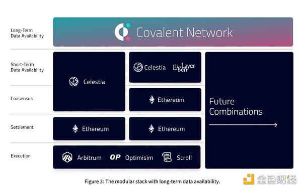 上图是Cavalent团队制作的模块化堆栈图,L2项目Arbitrum、Optimi**、Scroll等负责写入状态数据,以太坊负责资产托管和结算,共识层有以太坊和Celestia竞争,而DA层则是以太坊、Celestia和EigenLayer的三国杀,Covalent则负责L2状态数据的读取。