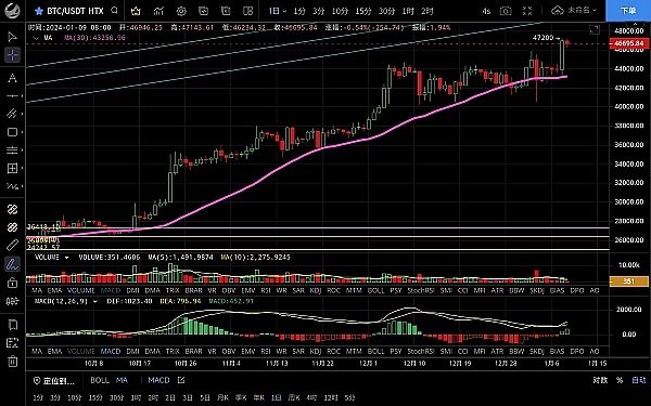 大饼昨日**跌至43195一线支撑,随后行情一路反弹上行突破新高,**触及47200一线受阻,恭喜跟上低多思路的朋友,**获利4000点,目前币价在46760附近运行,四小时级别k线大阳拉升后未能延续多头走势,短期行情受阻回落,有修复ma7均线的需求,行情震荡时间较久此次突破打开上方空间,macd多头逐步放量双线金叉向上,走势依旧偏向多头,日线级别多头趋势未被打破,k线四连阳向上拉升,虽短期滞涨回落但多头依旧强势,日内需关注回踩力度然后逢低做多,**关注etf消息面,不管通不通过切记做好风控,上方压制47200-48300,下方支撑46500-45800