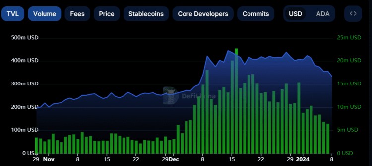 卡尔达诺的锁定总价值(TVL)和链上交易量也远高于 12 月初观察到的数字。