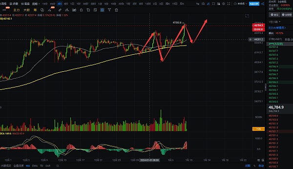 距离现货ETF获批越来越近,明日就会出结果,市场都在等待这个消息,大饼昨晚也是迎来突破反弹,**点位在47283位置,昨日已经提示大家市场多头情绪浓重,行情晚间突破机会很大,预计会到47000,大饼不负所望到达47000附近;以太也走了一波反弹,虽然没有到达2385位置,但**点到达2359位置,多单也是有**利润的,恭喜跟上笔者脚步的朋友再次获利;明日就是现货ETF获批的日子了,明日反弹的机会还是更大,但今日还是有回调机会;