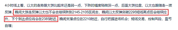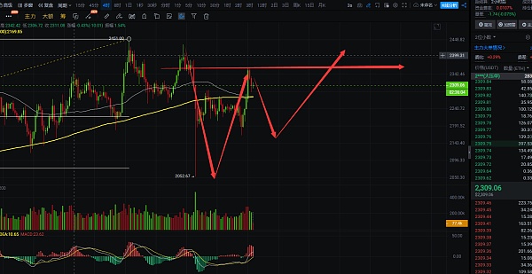 4小时线上看,以太的这波反弹到达2350附近后就开始下跌,说明短线上空头还是有**力度,以太的反弹基本上都是大饼带动,现货ETF也是以大饼为主,以太的波动就会小一点,后续出现补涨的机会也需要等待现货ETF这个事件过去后再看有没有机会,这波反弹虽然没有到达2385位置,但到达了短线压力2350附近后下跌,以太日内还会继续去给到回调,回调区间预计在2240-2205,到达该区间后再去考虑多,下方还有**的空间,自行可布局空,轻仓带止损;自行把握进场机会;短线交易,控制风险,盈亏自理;
