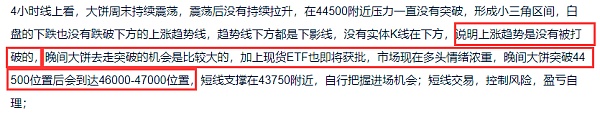 大饼反弹到达47000附近,该位置是存在**压力的,行情到达后也没有继续去拉升,而是在该位置收两根十字星,说明短线上空头还是有**的力量,日内继续去追涨不是很适合了,等待一波回调后再去做多单的布局,大饼日内回调区间预计在44180-43350,还有2000多个点的下跌空间可以去做空单的尝试,轻仓带止损去做即可,自行把握进场机会;短线交易,控制风险,盈亏自理;
