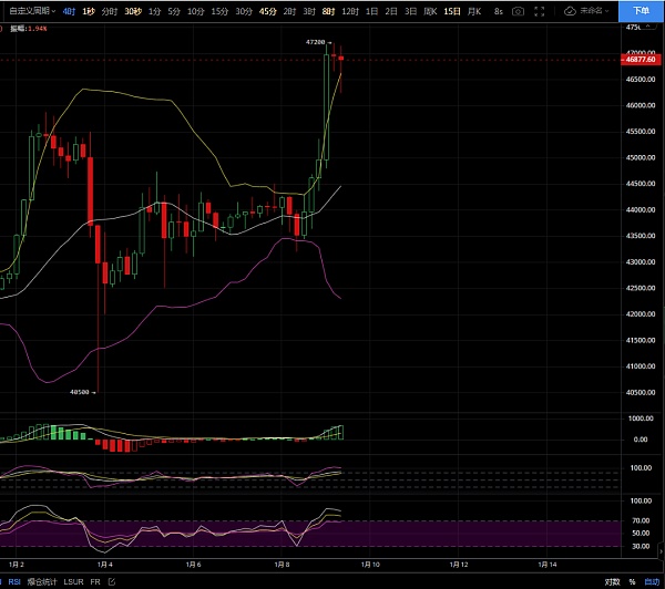 从四小时结构来看,各项指标均指向多头,布林带开口持续已成常态,币价延上轨四连阳持续拉升,上方多头通道又一次被打开,下方KDJ三线交叉上扬,MACD多头能量柱放量运行,由此可见多头还将延续,就看当下反弹力度能否继续冲一波新高。还是需要考虑ETF的通过与否,因而**关注的是43000再次成为短期强弱的重要临界点,若再次跌破43000,冲高反弹就结束,走一笔小级别的下跌甚至**别的下跌。保持在43000上方,还有机会再震荡或往上走一走。操作上保持低多为主高空为辅进行!