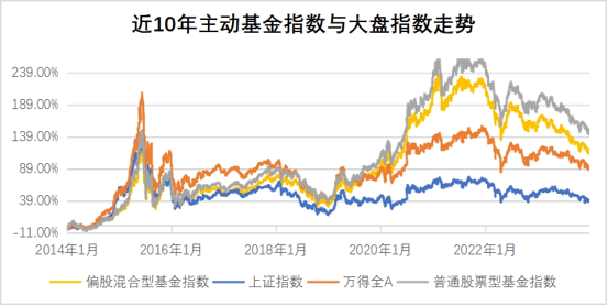 我们从长期来看,无论是偏股混合型基金指数还是普通股票型基金指数,都是大幅跑赢大盘的,主动基金可以利用基金经理的专业能力和市场洞察力,发现并把握市场机会。