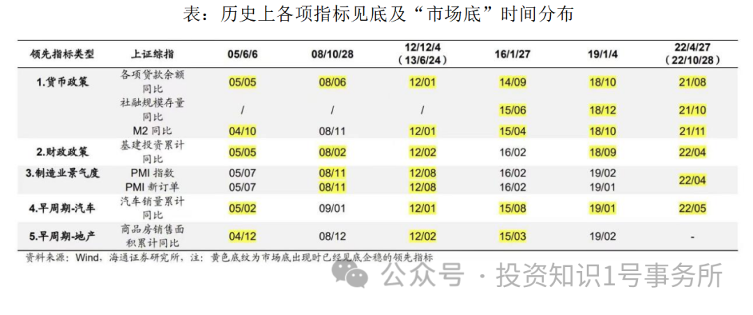 观察过去五轮市场调整期间,各项指标见底时间的分布。可以发现,在市场底部出现时,这五大指标中通常有至少3个以上的指标已经见底企稳。
