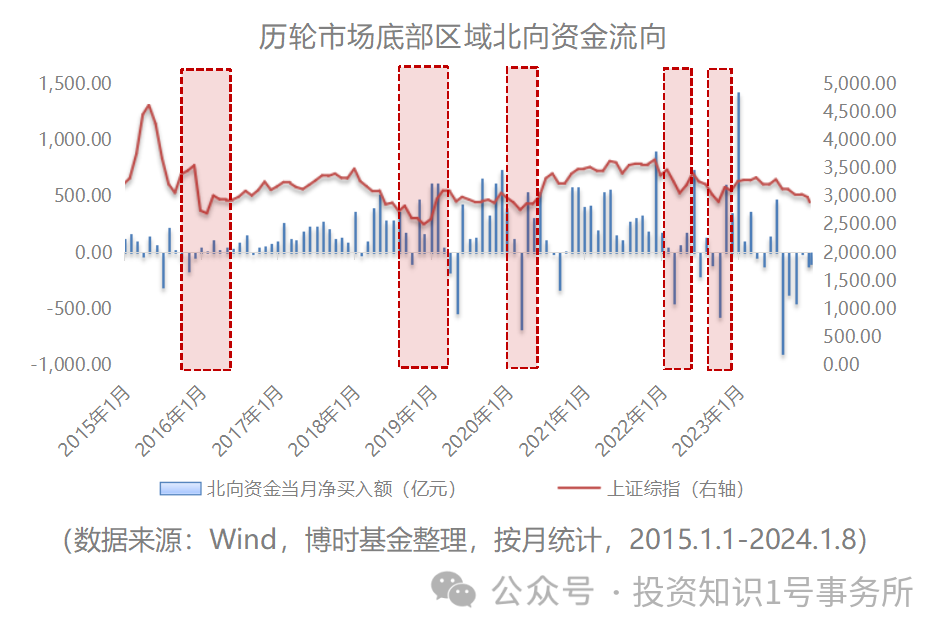 近年来,海外资金在A股中的比重逐年提高,在市场底部区间内也发挥着重要作用。例如2016年初、2019年初、2020年3月、2022年4月底、2022年10月底的五次市场拐点中,北向资金均有显著回流。