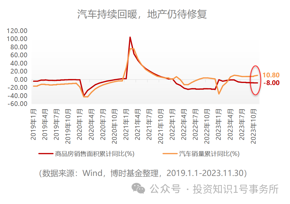 **是早周期行业指标。其中,汽车消费的拐点已经出现并且持续回暖。但商品房销量同比增速却仍在回落,尚未修正,说明地产端需求修复依然偏弱。