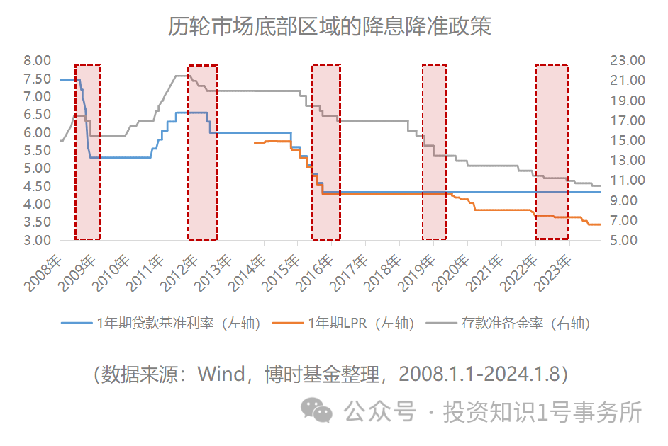 虽然市场磨底的过程各有差异,但“政策底”通常先于“市场底”出现,例如宽松的货币政策、财政**等,以此催化市场预期持续扭转。回顾过去六轮市场底部区间,其中都有降息或降准等政策出台。