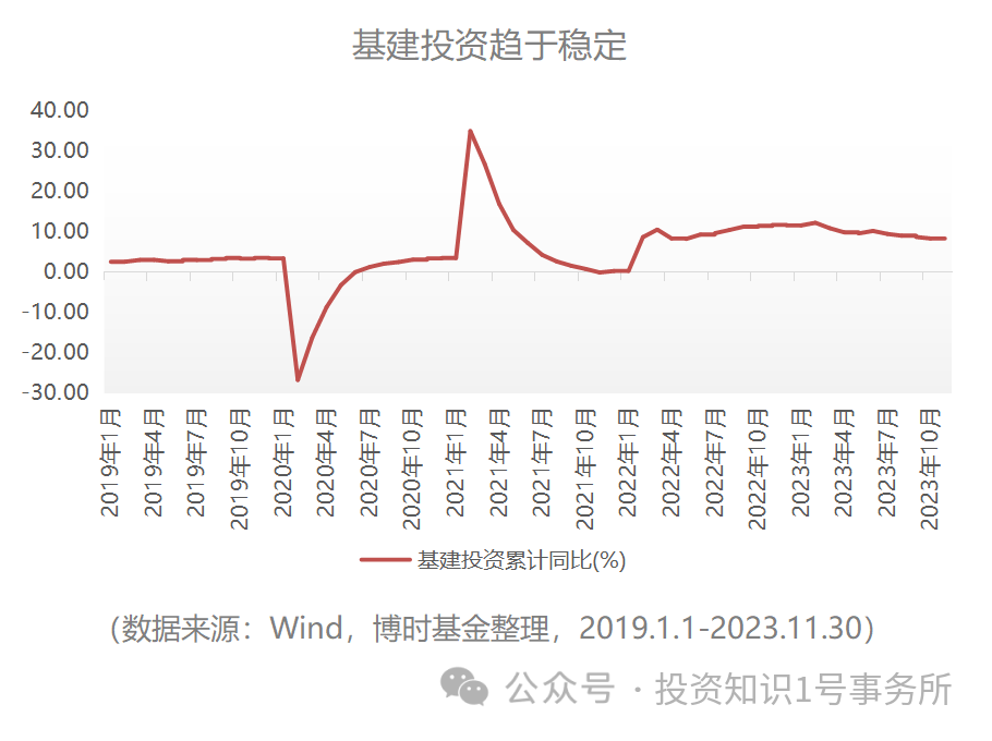第二个,财政政策指标。稳增长政策持续发力,万亿国债增发,基建投资始终保持相对稳定增速。