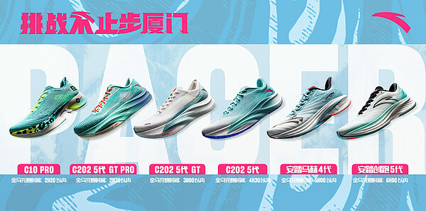 2023年,安踏发布全新的少数派C 马拉松竞速家族产品,其中包含专为全⻢300精英& 大众跑者打造的"破三之选"—— C202 5代 GT,再到更为进阶的230"破速之选"—— C202 5代 GT PRO,更有安踏"前掌**"C10 PRO为全马220以内**运动员破纪录而生,助力贝克勒在瓦伦西亚创造2:04:19的成绩 —— 国产跑鞋**战绩。"少数派C",是安踏给予"少数派"跑者们的代号,用取自"Challenge"的"C"来指代这群"少数派"跑者,是安踏C202系列对他们的致敬:挑战202,**挑战自我、超越极限。以C10 PRO与C202 5代 GT PRO领衔的安踏尖端竞速跑鞋,截至2024年1月7日,已助力运动员188次登上各类马拉松赛事的领奖台,真正践行了C202中C所代表的Challenge(挑战)。