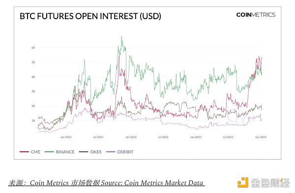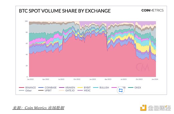 各交易所BTC现货交易量份额显示,交易所格局日趋分散。这反映在币安的统治地位从Q1的超过75%下降到2024年1月的30%以下。其他交易所,例如Coinbase和Bullish,因此获益,导致**化交易所的交易量更均衡地分布。