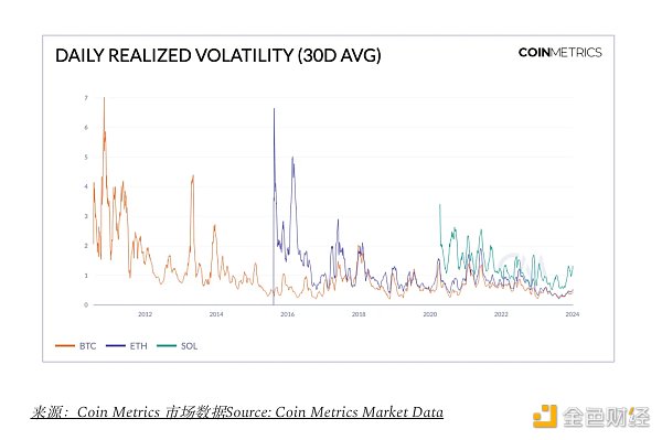 BTC和其他加密资产的历史波动性一直是人们批评的一个点,将其视为高风险投资。虽然在它们早期阶段确实如此,但BTC的平均已实现波动性长期呈下降趋势,表明它已发展成为更成熟的资产。下面的图表展示了ETH和SOL的类似趋势,它们进入市场较晚,相对于BTC表现出更大的波动性。在加密资产领域,很明显,这些资产表现出不同程度的波动性和成熟度,从而影响其整体市场结构和在投资组合中的作用。