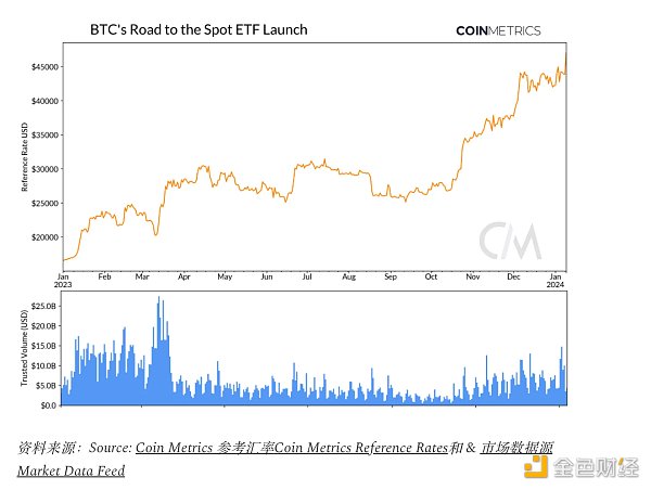 这股热情也反映在比特币的价格上,2023年飙升了156%。尽管可信赖的现货交易量在**季度回升,但3月硅谷银行危机后陷入停滞。然而,随着对ETF的期盼升温,交易量再次攀升,目前平均约为100亿美元,但仍低于FTX崩盘前的水平。比特币的流动性仍然是实现该资产**交易的关键因素,尤其是在即将推出ETF的情况下。