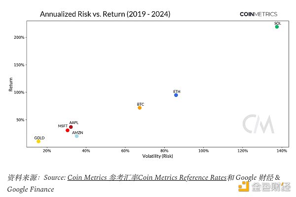 在 5 年的时间里,将数字资产的风险和回报与可投资领域中的其他资产放在一起,揭示了有关其在投资组合中的作用的有趣见解。黄金等传统资产的风险和回报潜力**,因此具有避险地位,并将该商品置于与苹果 (**PL)、微软 (MSFT) 和亚马逊 (AMZN) 等大型科技股相对的另一个宇宙中。它们都表现出相似的特征。另一方面,该图表中所示的数字资产显示出独特的特征。BTC 作为开创性和**的数字资产,其波动性低于 ETH 和 SOL,但提供比科技股更大的回报潜力,这表明它已演变成一种成熟且以增长为导向的资产。此外,其很大程度上与传统资产的不相关性uncorrelated nature进一步凸显了其在投资组合多元化方面的价值,并增强了其对寻求不相关回报的投资者的吸引力。