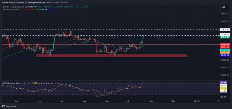截至撰写本文时,BTC 价格交易价格为 29,905 美元,较昨天上涨超过 1.4%。