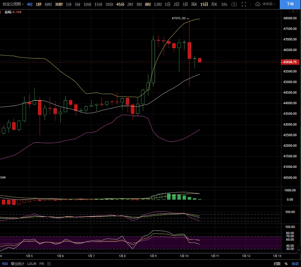 今早凌晨比特币再一次出现天地针,这波天地插针行情的波动还是非常大的。行情因为ETF获批的新闻,一路上涨至48000一线位置受阻,之后被SEC主席证实这是一个假新闻,之后便又插针下来。当前币价在46000附近徘徊,还好昨晚的46000多虽未达到自己的目标,在47000附近就离场了,但也吃的也挺不错了,(不信可看昨日文章思路),昨日以太吃的还是饱饱的,在2275的多,差点止损,还好没有放弃,一路上行到了自己的目标,2310的位置止盈,咱们散户要做到在币圈要见好就收。目前看大饼日线也是由阳转阴。咱们看看今日盘面走势情况。