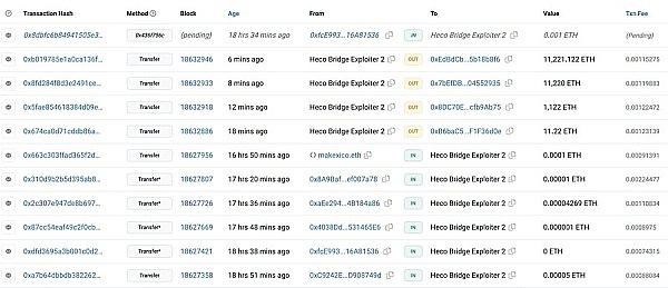 Heco Bridge攻击者在去年11月底的攻击事件中,共将逾2.35万枚ETH转至4个新地址