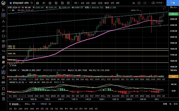 以太坊日内走势比大饼强势,昨日整体呈震荡下行**跌至2227一线支撑反弹,凌晨多头发力加速拉升,**触及2395一线受阻回落,恭喜跟上昨日思路的朋友多单获利140点,目前比价在2385附近运行,四小时级别k线连阳拉升突破前高,macd呈多头到没有明显放量双线金叉状态,短期行情暂时滞涨,但回踩力度不大,整体还是偏向多头,上方关注2400阻力区域,不破的话预计白盘将持续震荡直到消息面公布,日线级别k线大阳拉升可见多头强势,macd有金叉迹象,若能站稳2400预计会走出新的突破,目前还是围绕消息面来进行操作,稳健者观望即可,上方压制2440-2530,下方支撑2330-2280