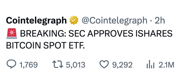 2023年10月16日,据CoinTelegraph报道称,美国证监会已批准贝莱德的iShares比特币现货ETF。在短短20分钟内,当时爆仓了1亿美元。但很快市场发现不对劲,因为彭博社等主流媒体并没有报告**内容。
