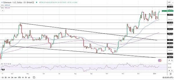 如果以太币突破周三高点2412美元,将支持其向2457美元阻力位移动。