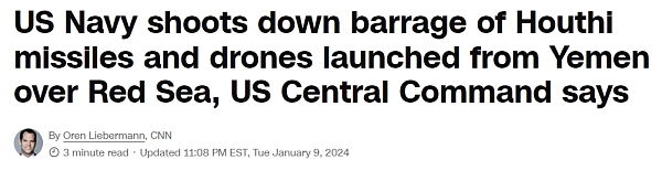 伊朗支持的胡塞武装分子加大了对红海商船的袭击力度,旨在抗议以色列在加沙的战争。多家航运公司已暂停运营,转而进行绕非洲更远的航线。胡塞武装誓言要继续发动袭击,直到以色列停止加沙冲突,并警告说,如果该民兵组织本身成为攻击目标,他们将袭击美国军舰。