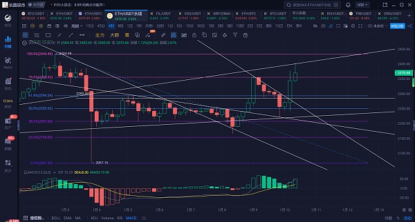 以太坊上个交易日行情走出大幅波动,从早间的2360附近开始回踩,白盘整体处于下跌趋势中,晚盘更是插针2217一线开始震荡,而今天凌晨随着SEC推特消息的推出,行情大幅反弹,刚刚以太更是走出了2400的高点。随着SEC对于ETF审核日期的临近,行情也是呈现了较**动的走势,大家**要谨慎对待。