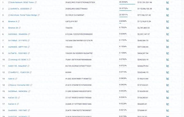 除了DeXe总合约的40%占有外,跨链桥Wormhole中的Token占比也超过了20%