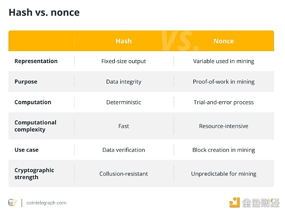 在区块链的背景下,随机数是矿工用来生成满足特定要求的哈希值的变量,而哈希值是从输入数据生成的固定大小的输出。 下表列出了哈希值和随机数之间的区别。