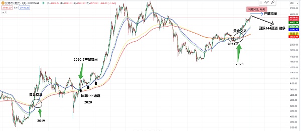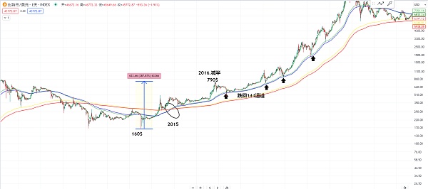 那更早之前比特币的黄金交叉还是在2015年 所以我们再看一下比特币在2015年 从当时160美元的底部涨到接近800美元也是涨了很多倍 然后我们可以看一下他在产量减半之后 后面的大牛市在减半之后是给足了空间的机会 只要有跌回144通道就是100倍做多的买点
