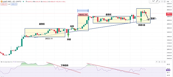 那么到现在已经通过了 目前还是没有突破48000 当然我认为有可能在这个位置还是会继续往上进攻 或者我们可以观察一下最近的rsi指标 其实在突破K线这里也是一个突破的点位 当这个趋势突破的时候 你要去追多也可以 但是利润并不会有很多