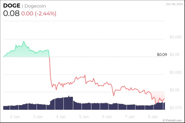 截至发稿时,DOGE 交易价格为 0.07804 美元,过去一天下跌-2.44%,最近 7 天下跌-13.23%,上个月下跌-23.85%。