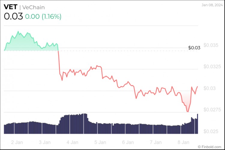 At the time of writing, VET is changing hands at $0.03014, marking an increase in the price of 1.16% over the past 24 hours, contrary to the losses over the last 7 days of -13.01%, and adding to gains of 9.18% in the previous month.
