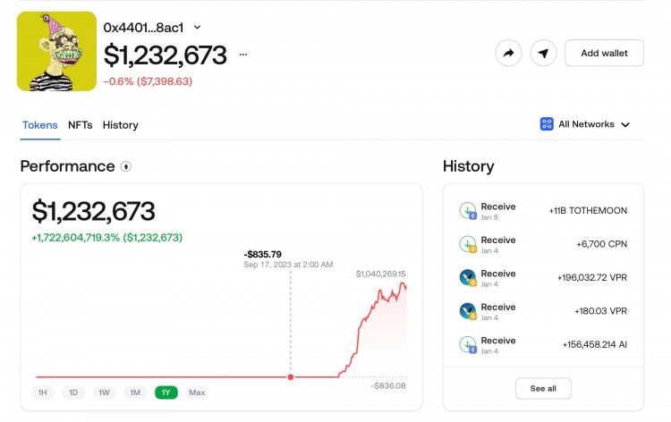在短短 78 天内,这个加密钱包从 836 美元涨到 1,235,369 美元