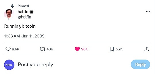 这两天,当时和中本聪有过邮件往来,并协助中本聪测试比特币挖矿软件的哈尔芬利,在2009年1月11日的推特被翻出来,内容是“Running bitcoin”。