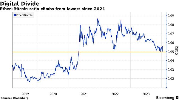 对比特币ETF的炒作导致2023年以太币的表现有所落后。本周初,以太币相对于比特币的价格比率处于2021年以来的**水平。此后,由于以太币最近的上涨,该比率不断走高。