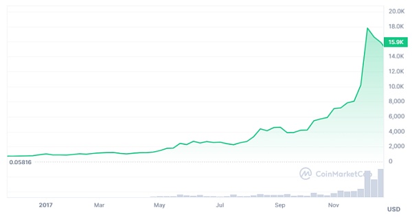 2017 年,加密货币迎来了牛市,比特币的价格从年初的**不到 900 美元上涨到年末的 1.8 万 美元,涨幅超过20 倍。