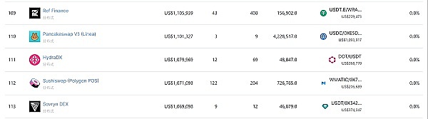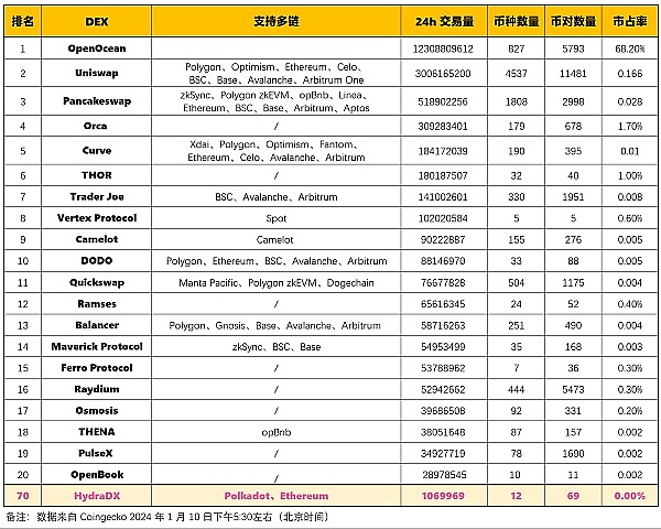(1)HydraDX 和 TOP20 DEX 的对比