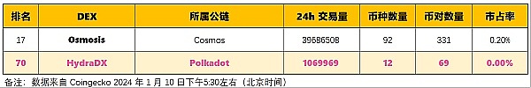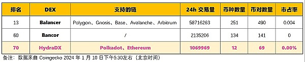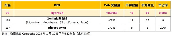 2024 年 1 月 10 日,HydraDX 在 Coingecko DEX 中按“24 小时交易量”的排名为:111 名。